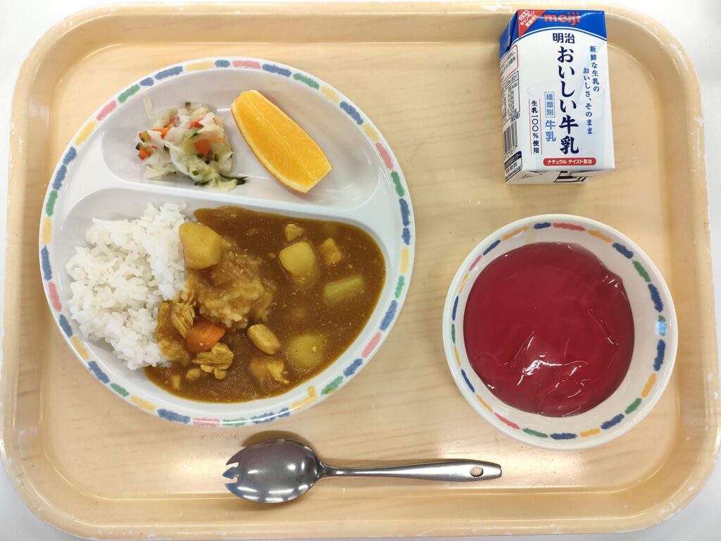 子どもたちに大人気のカレーライスは、豚肉や野菜がたっぷり入り、エネルギーと栄養を同時に摂ることができます。スパイスの香りが食欲を刺激し、「おかわり!」の声が響く献立です。キャベツのフレンチサラダはさっぱりとした味わいで、口の中をリフレッシュさせ、ビタミンCや食物繊維を補えます。デザートのオレンジは酸味と甘みのバランスがよく、免疫力アップにも効果的。牛乳はカルシウムを補給し、骨や歯の健康を守ります。元気いっぱいで週を締めくくる、栄養満点の献立でした。