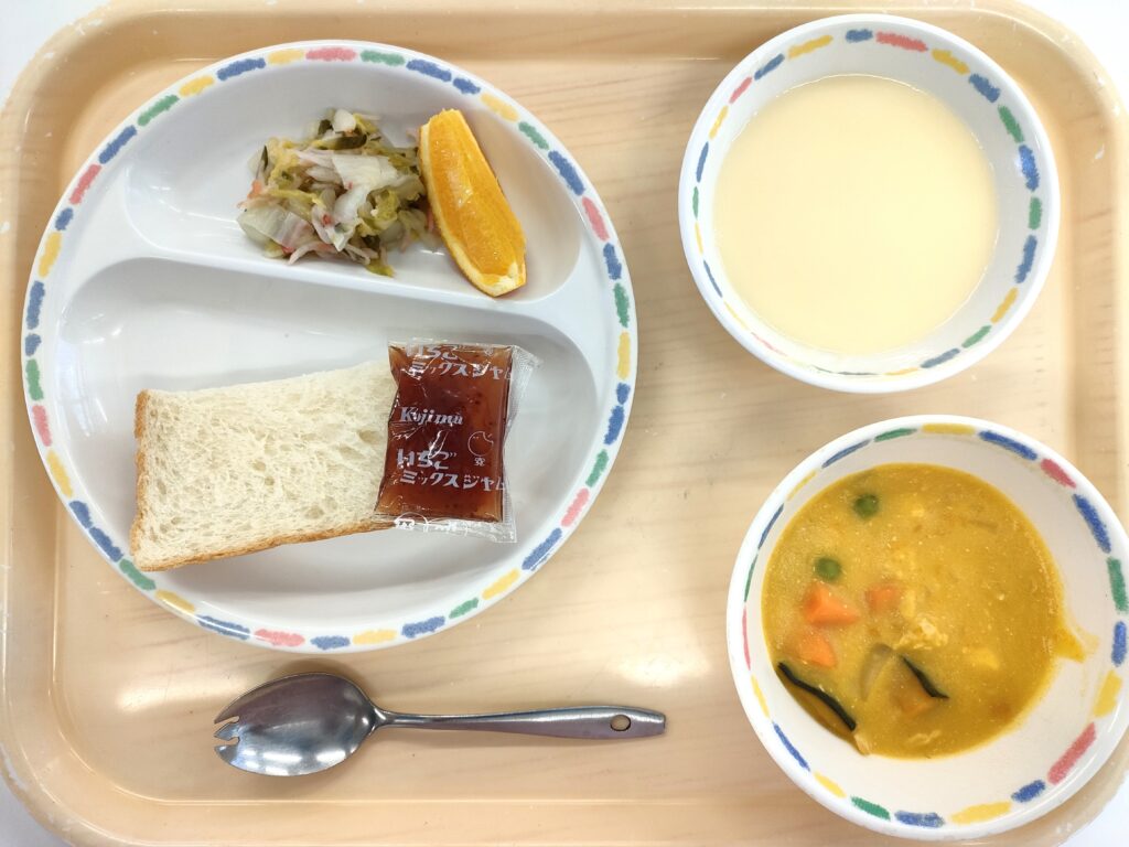 この日は洋風の献立。かぼちゃの自然な甘みが広がるパンプキンシチューは、体を温め、心までほっとする優しい味わいです。かぼちゃにはβカロテンやビタミンEが多く含まれ、免疫力アップや風邪予防にも効果的。白菜のフレンチサラダはシャキッとした食感と爽やかな酸味があり、シチューとの相性も抜群です。デザートのオレンジはみずみずしく、ビタミンCで元気をチャージ。金曜日らしい明るい彩りで、1週間を締めくくるのにふさわしい洋風メニューでした。