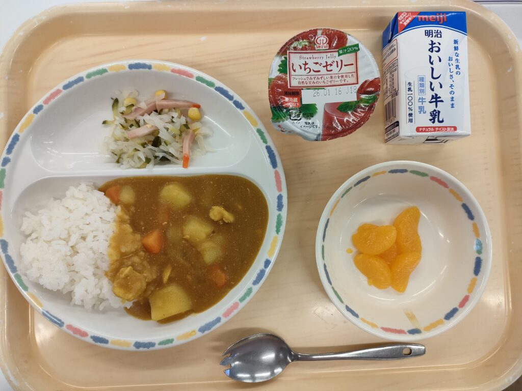 12月12日(金):カレーライス・大根のフレンチサラダ・みかん 金曜日は定番のカレーライス。今回は鶏むね肉を使用しています。鶏むね肉には「イミダペプチド」という成分が含まれており、脳や体の疲れを取る効果があると言われています。カレーのスパイスには食欲を増進させ、新陳代謝を高める働きがあるので、寒い日でも体がポカポカになります。 サラダには冬野菜の代表、大根を使いました。大根にはアミラーゼ(ジアスターゼ)という消化酵素が含まれており、消化を助け、胃腸の働きをサポートしてくれます。旬のみかんはビタミンCの宝庫。薄皮や白い筋には「ヘスペリジン」という血管を強くする成分が含まれているので、できれば筋も一緒に食べるのが理想的です。